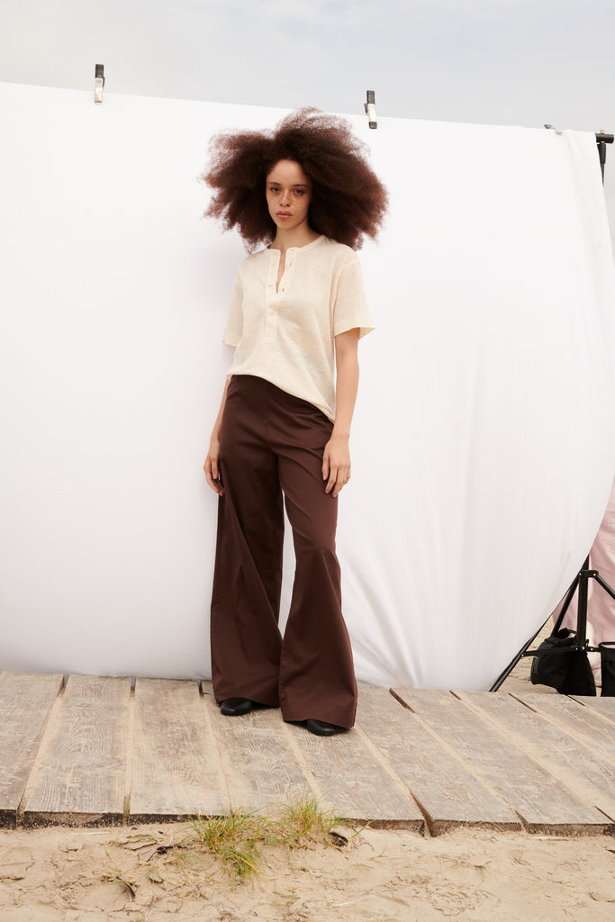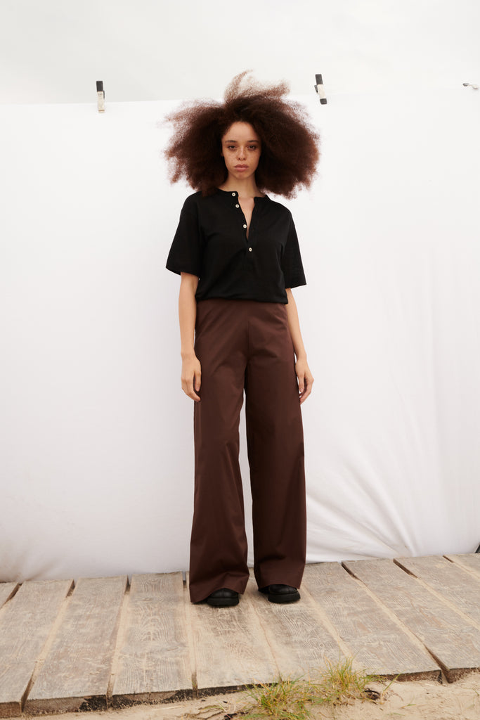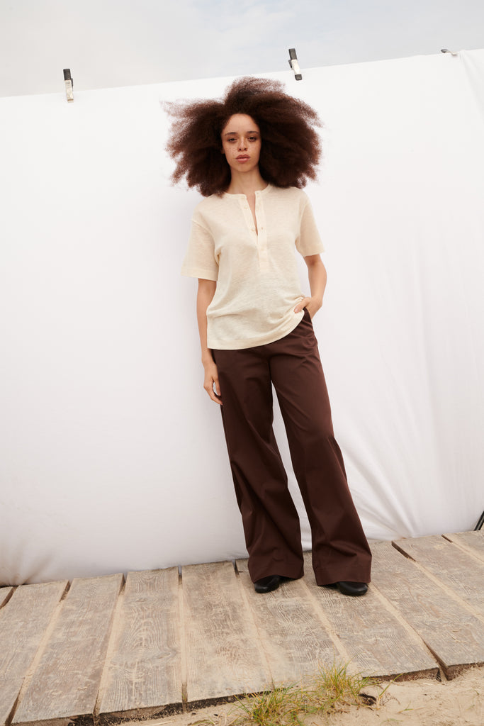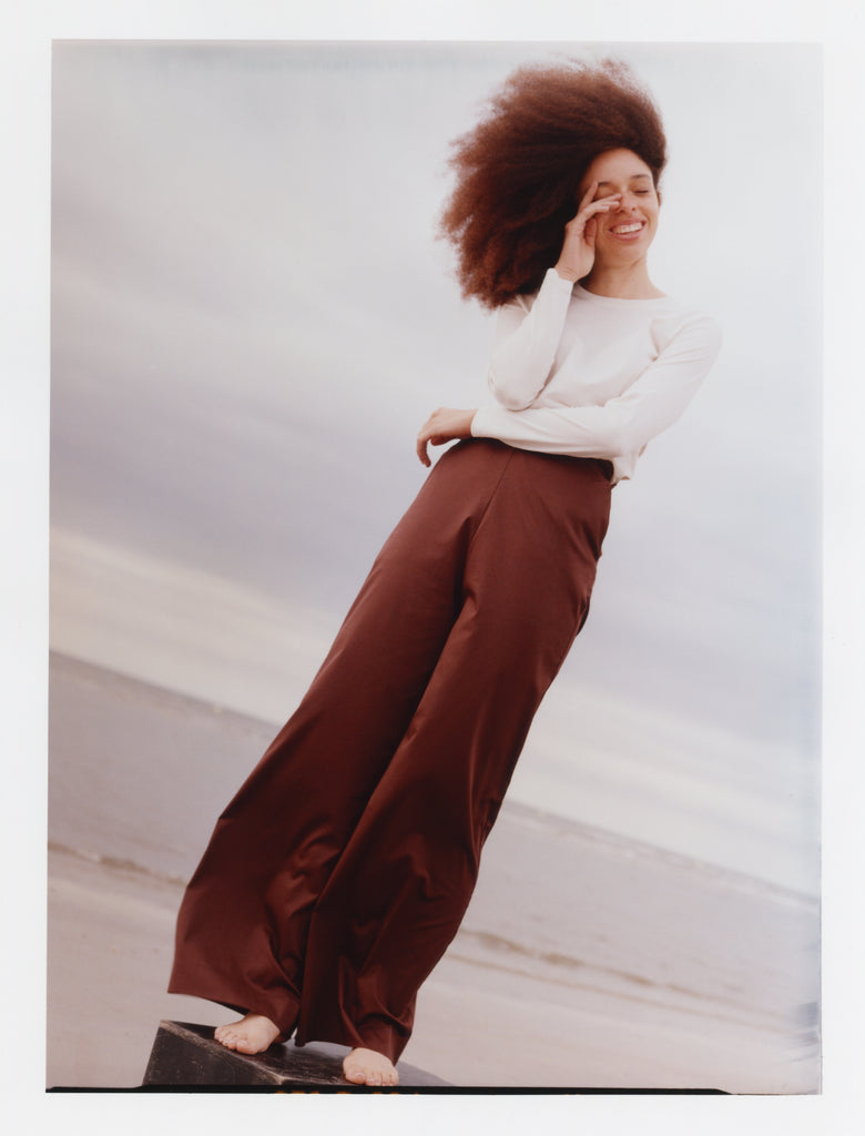 Mimi Der Stoff liegt richtig angenehm und leicht auf der Haut. Ich mag den High Waist Wide Leg Schnitt super gerne. Das Bündchen am Bauch ist elastisch und schneidet nicht ein und ist daher echt bequem - auch noch nach einem guten Abendessen! :D